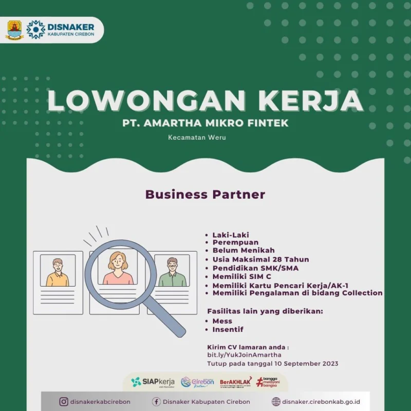Amartha, perusahaan fintech yang memberdayakan UMKM melalui pendanaan mikro, sedang mencari Business Partner – Staff Lapangan Cirebon (Point Kadawung). Posisi ini berperan sebagai ujung tombak dalam memperluas jaringan nasabah, memberikan pendampingan ekonomi rumah tangga, serta memastikan proses pembiayaan berjalan lancar sesuai kebijakan perusahaan.