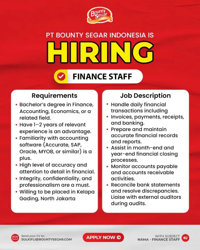 PT Contoh Indonesia, perusahaan terkemuka di sektor jasa keuangan dengan jaringan operasi yang meliputi Jakarta dan kota-kota utama lainnya, sedang membuka lowongan untuk posisi Finance Staff. Posisi ini sangat penting untuk mendukung tim keuangan dalam menjaga akurasi laporan, kepatuhan pajak, serta memberikan insight keuangan yang dapat memperkuat keputusan bisnis. Jika Anda seorang lulusan baru atau memiliki pengalaman dasar dalam akuntansi dan menguasai tools digital, ini adalah kesempatan ideal untuk memulai karir profesional Anda di lingkungan yang dinamis dan berorientasi pada pertumbuhan.